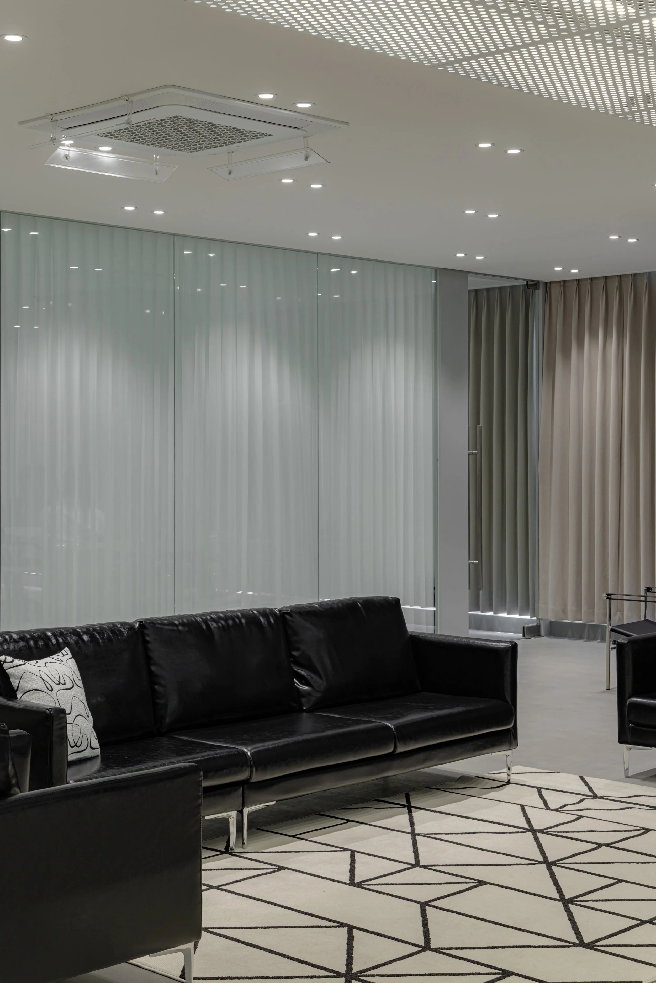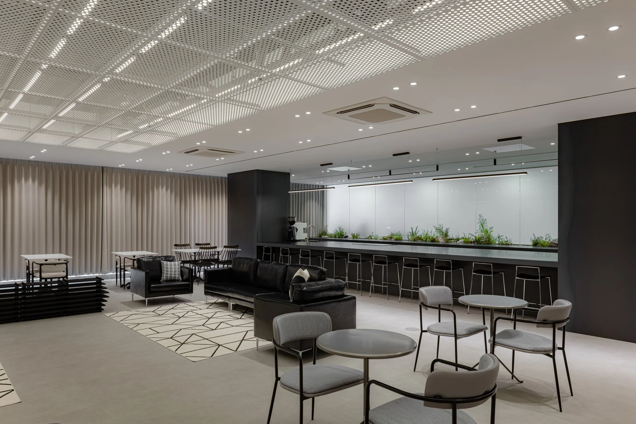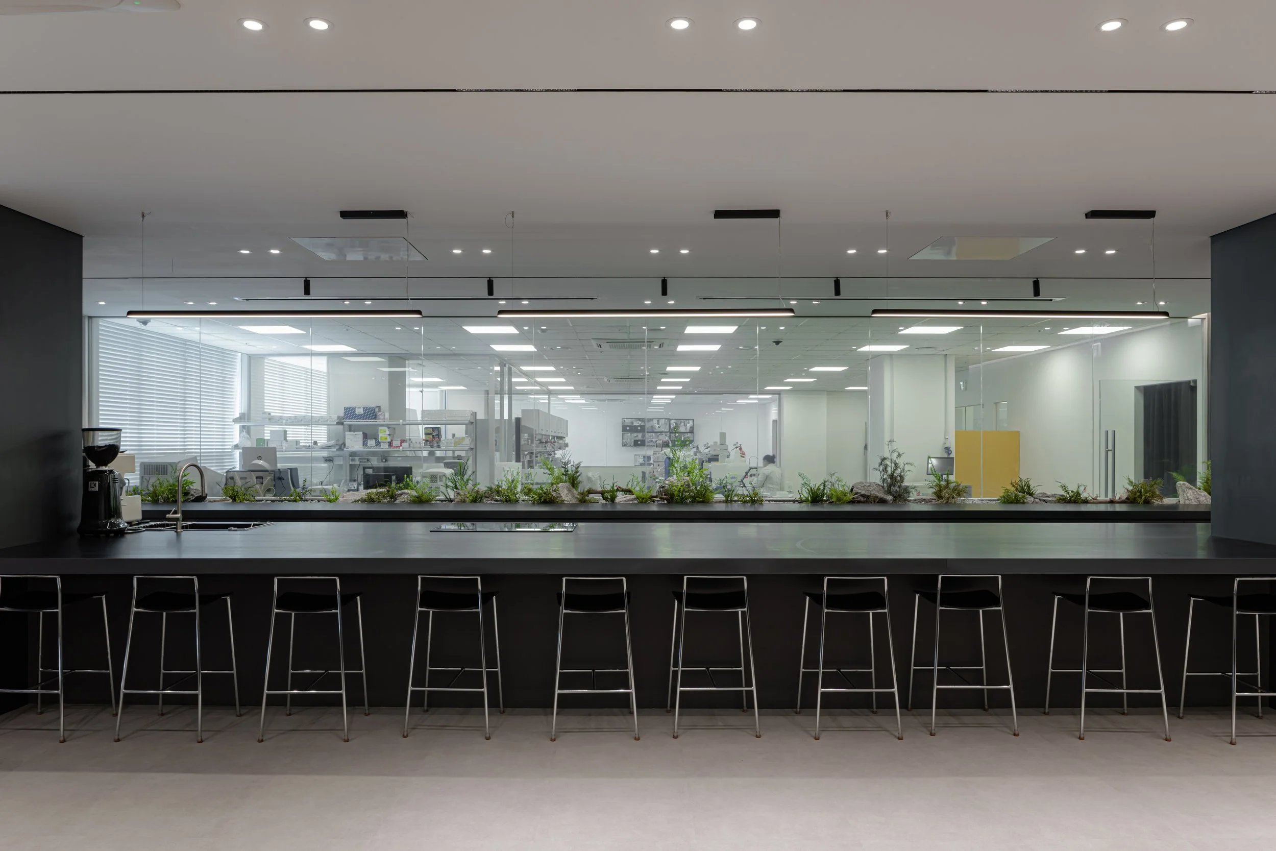 The overall tone of the interior merges the identities of laboratory and office. The lab is finished in white, emphasizing cleanliness and clarity, while the lounge employs stainless steel and monochrome films to create a timeless atmosphere. The relatively low ceiling height is mitigated through perforated panels, producing a greater sense of openness.